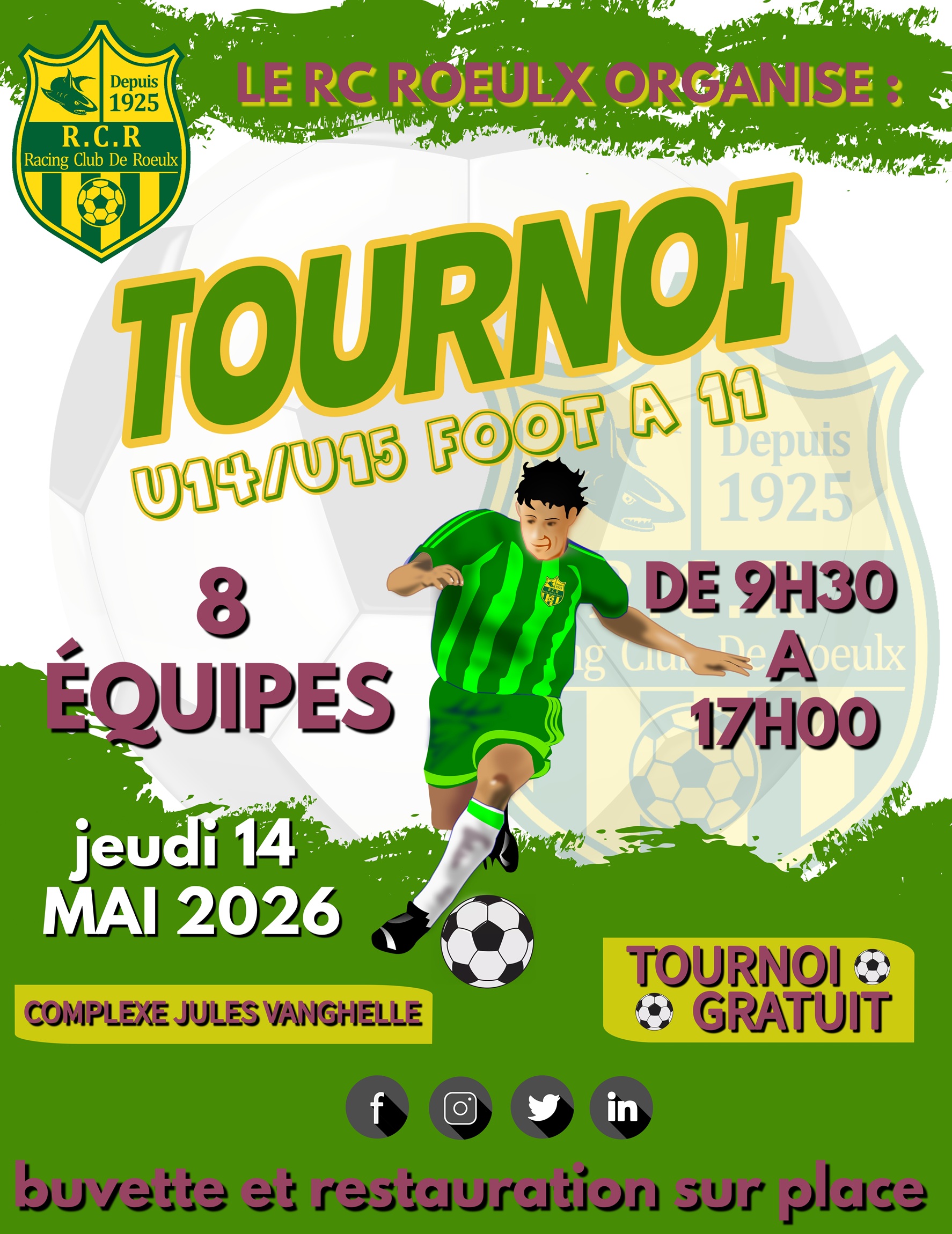 Le club de "R.C. ROEULX" est heureux de vous convier à son tournoi annuel U15. Cette année, nous accueillerons 8 équipes pour une journée complète de football dans une ambiance conviviale.