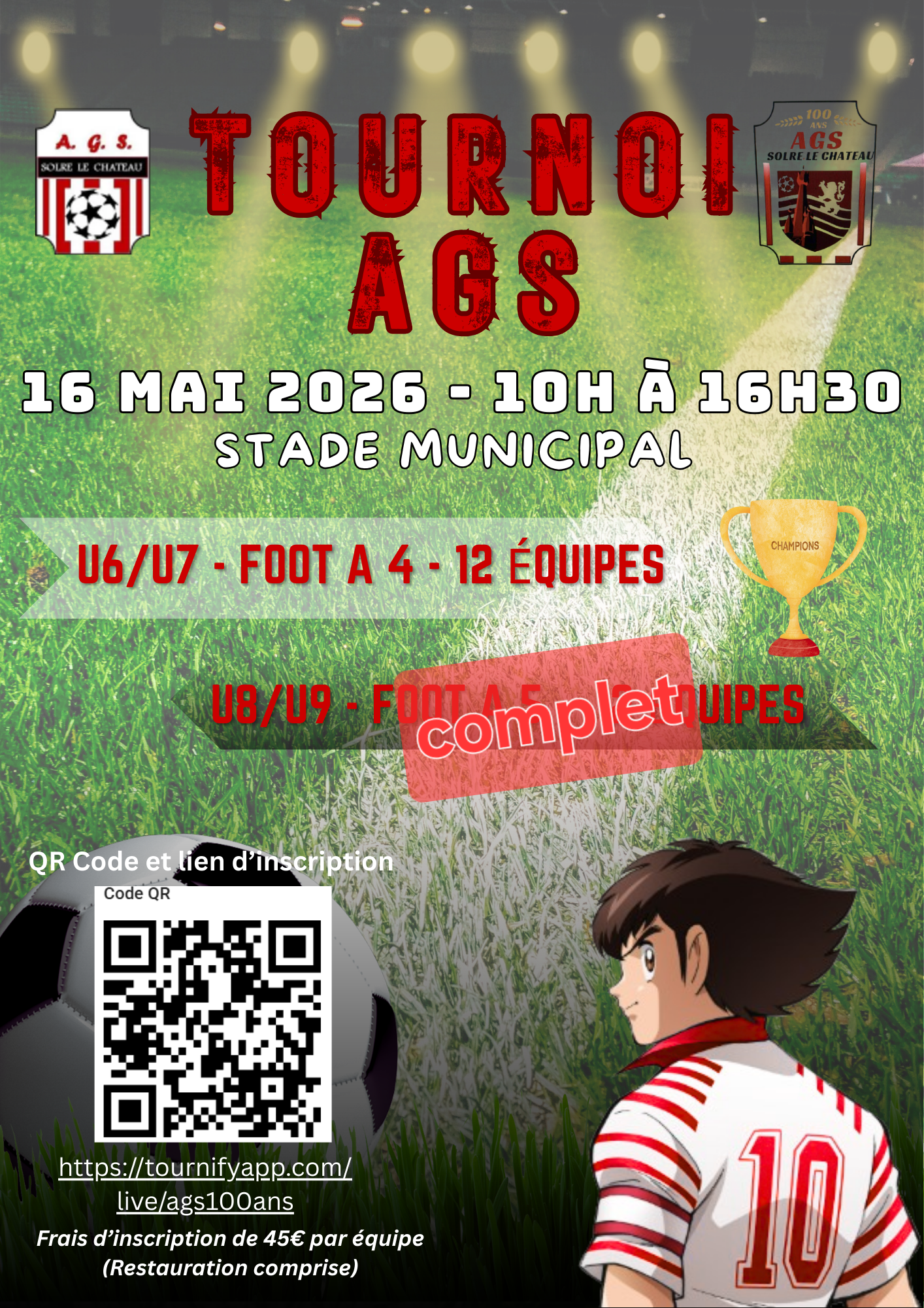 L'AGS Solre-le château est heureuse d'inviter vos équipes à son 1er tournoi, une journée dédiée au football des jeunes, placée sous le signe du fair-play et du plaisir de jouer. Nous accueillons dans un cadre familial, les catégories U6/U7 (foot à 4) et U8/U9 (foot à 5), pour un tournoi ou la bonne humeur et le respect seront présent. 🏅Tous les enfants repartiront récompensés.🏅 📅 Le samedi 16 mai 2026, ⏰de 10h à 16h30 🌍Stade Municipal - Solre-le-Château. Places limitées : 12 équipes par catégories, 2 équipes maximum par club. Foot à 4 --> (4 Joueurs + 2 remplaçants max par équipes) Foot à 5 --> (5 Joueurs + 2 remplaçants max par équipes) ⚽️5 matchs de poule et 2 matchs de classement pour un total de 70 à 80 minutes de jeu par équipe⚽️ 🍔Une restauration sera prévu sur place. 💰Une participation de 45€ est demandée par équipe comprenant la restauration pour 5 joueurs, 2 remplaçants et 1 entraineur. Le réglement par chèque est à faire parvenir à l'ordre suivant : Avant garde Solrezienne. Le paiement vaudra acceptation de votre participation. L'AGS vous attend nombreux.
