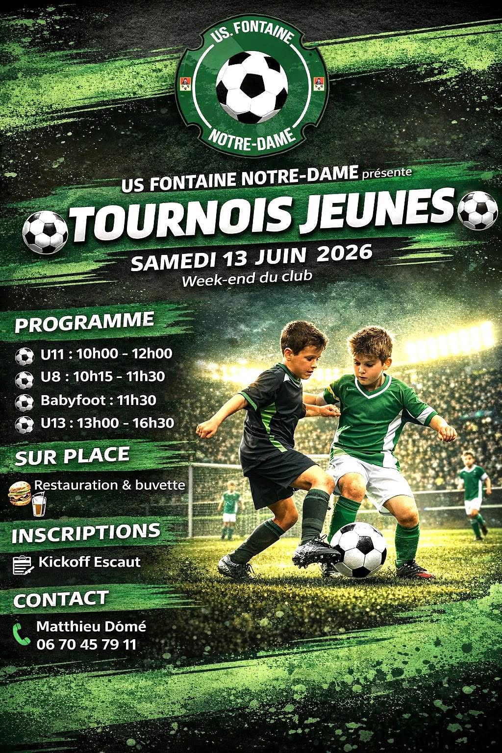 Le club de "U.S. FONTAINE NOTRE DAME" est heureux de vous convier à son tournoi annuel U8. Cette année, nous accueillerons 6 équipes pour une journée complète de football dans une ambiance conviviale.